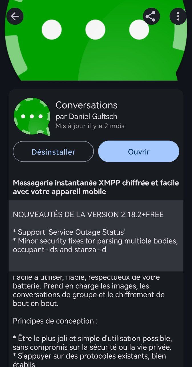 Recherchez "Conversations" sur F-Droid puis installez l'application.
