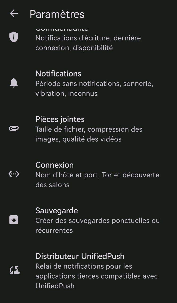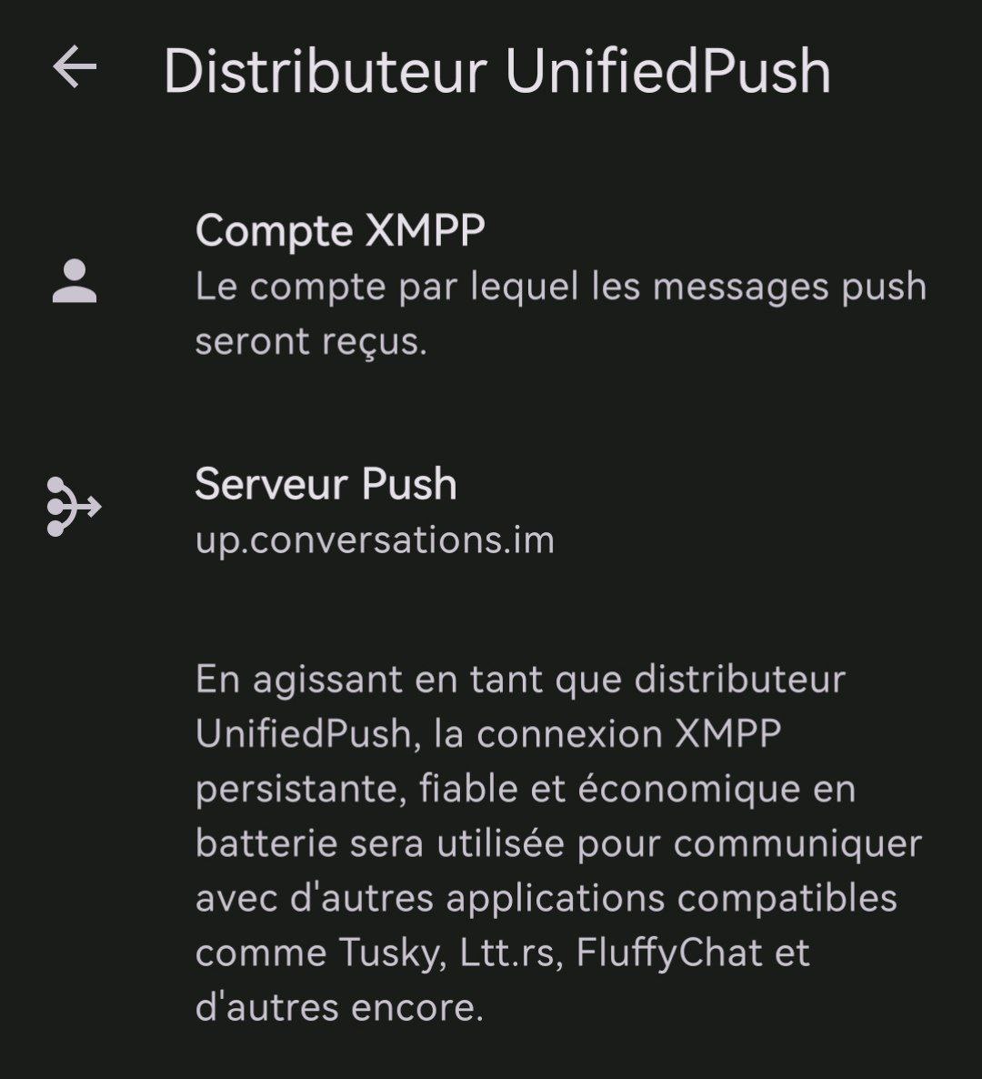 Si vous avez téléchargé Conversations depuis F-Droid, les notifications push ne sont pas configurées par défaut. Pour recevoir les notifications, il faut activer un service externe depuis les paramètres de Conversations.