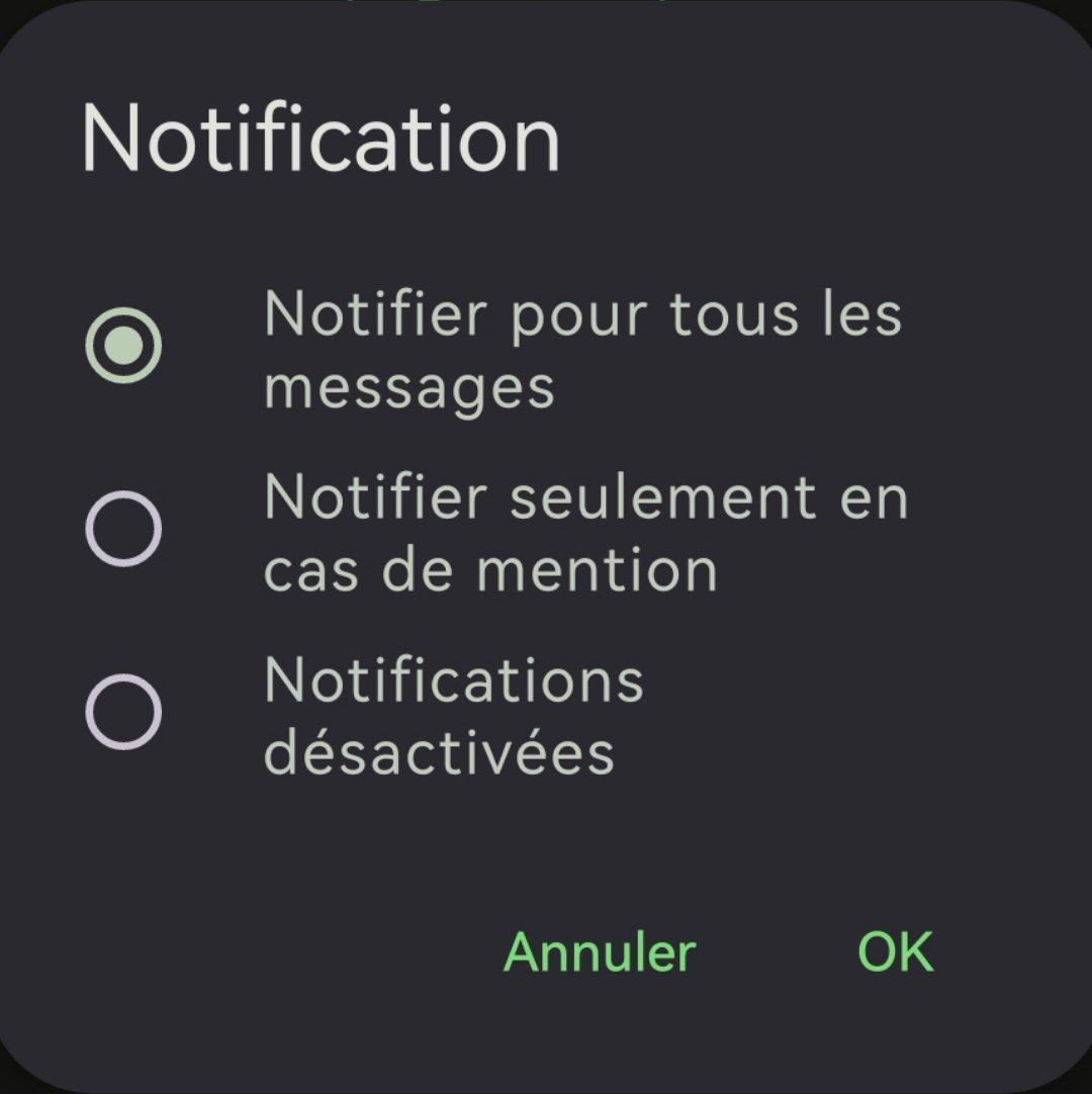 - Étape spécifique pour les salons de discussion : Si vous le souhaitez, il faut également activer les notifications pour tous les messages du groupe, ou bien vous ne serez notifié que pour les mentions de votre nom d'utilisateur. Pour cela, allez dans les paramètres du salon, puis cliquez sur la cloche, et enfin activez toutes les notifications.