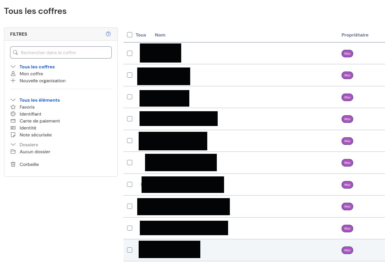 Il est possible, sur cette interface, d’ajouter un nouvel identifiant ou une nouvelle identité en cliquant sur le bouton « Nouveau > Élément », en haut à droite de l’écran.